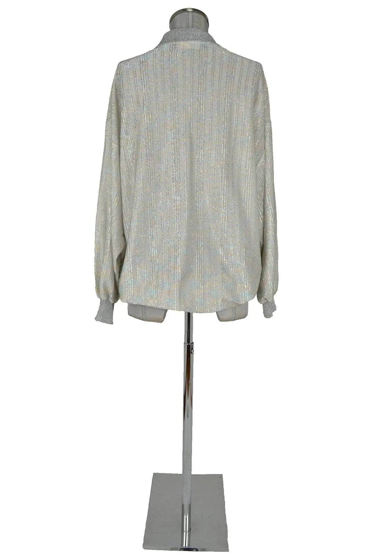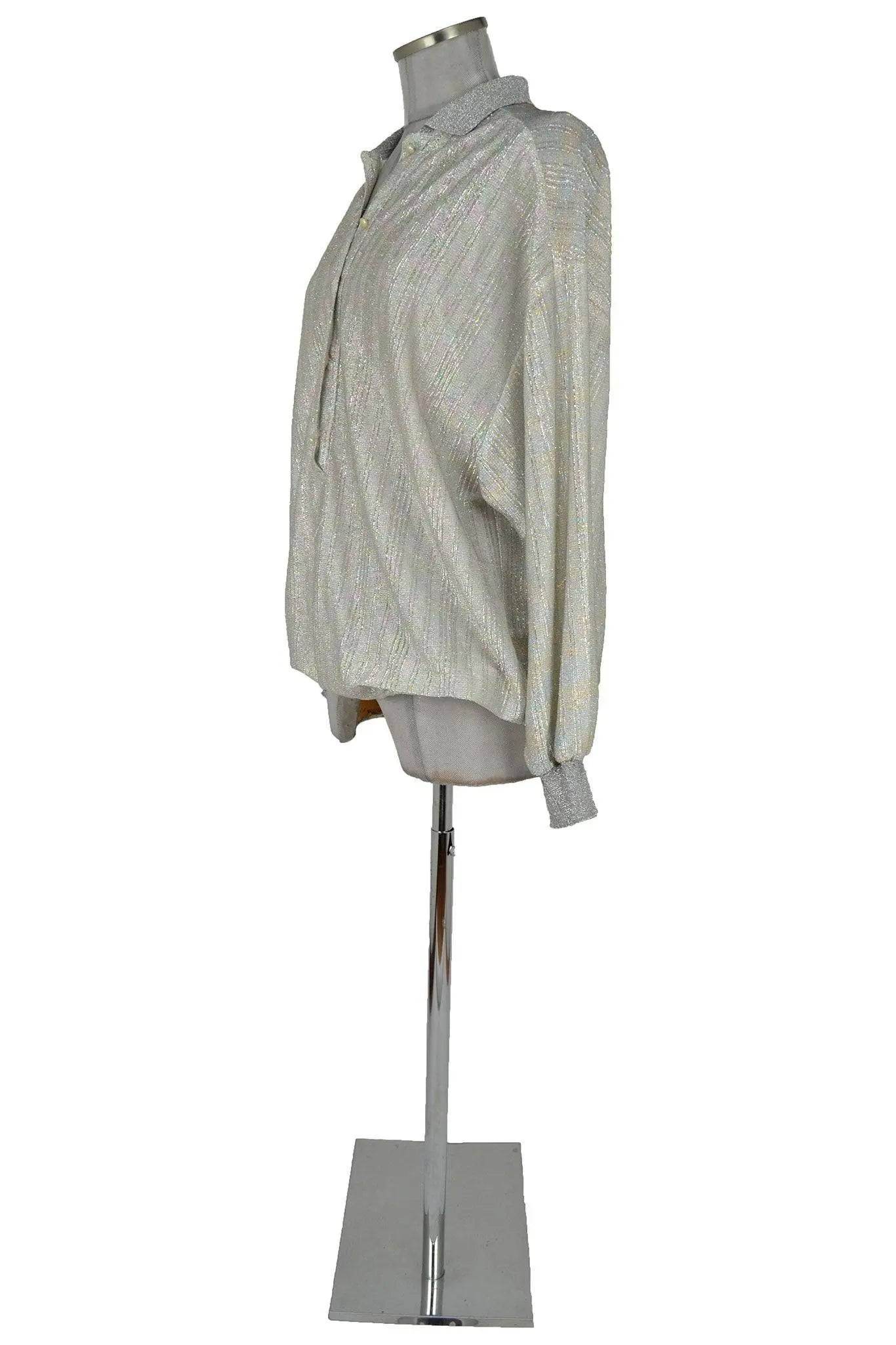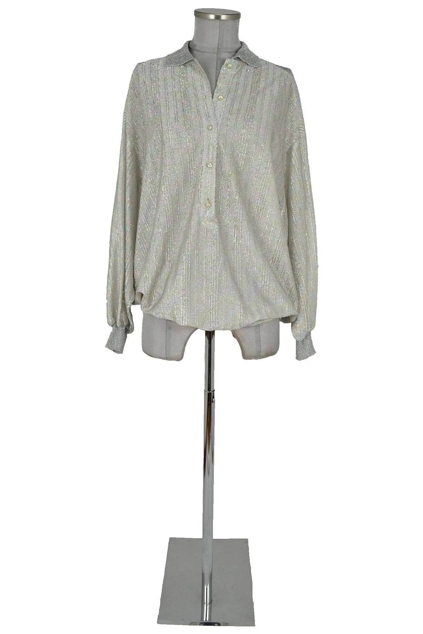 Noleggio abito camicia donna di taglio maschile, a righine di lamé, con colletto a polo e polsi stretti; utilizzabile in varie occasioni da sola o come sottogiacca, ha uno stile brillante e sbarazzino che rimanda alle soubrette televisive degli anni '70, ma diventa elegante con un tailleur scuro o una gonna lunga.