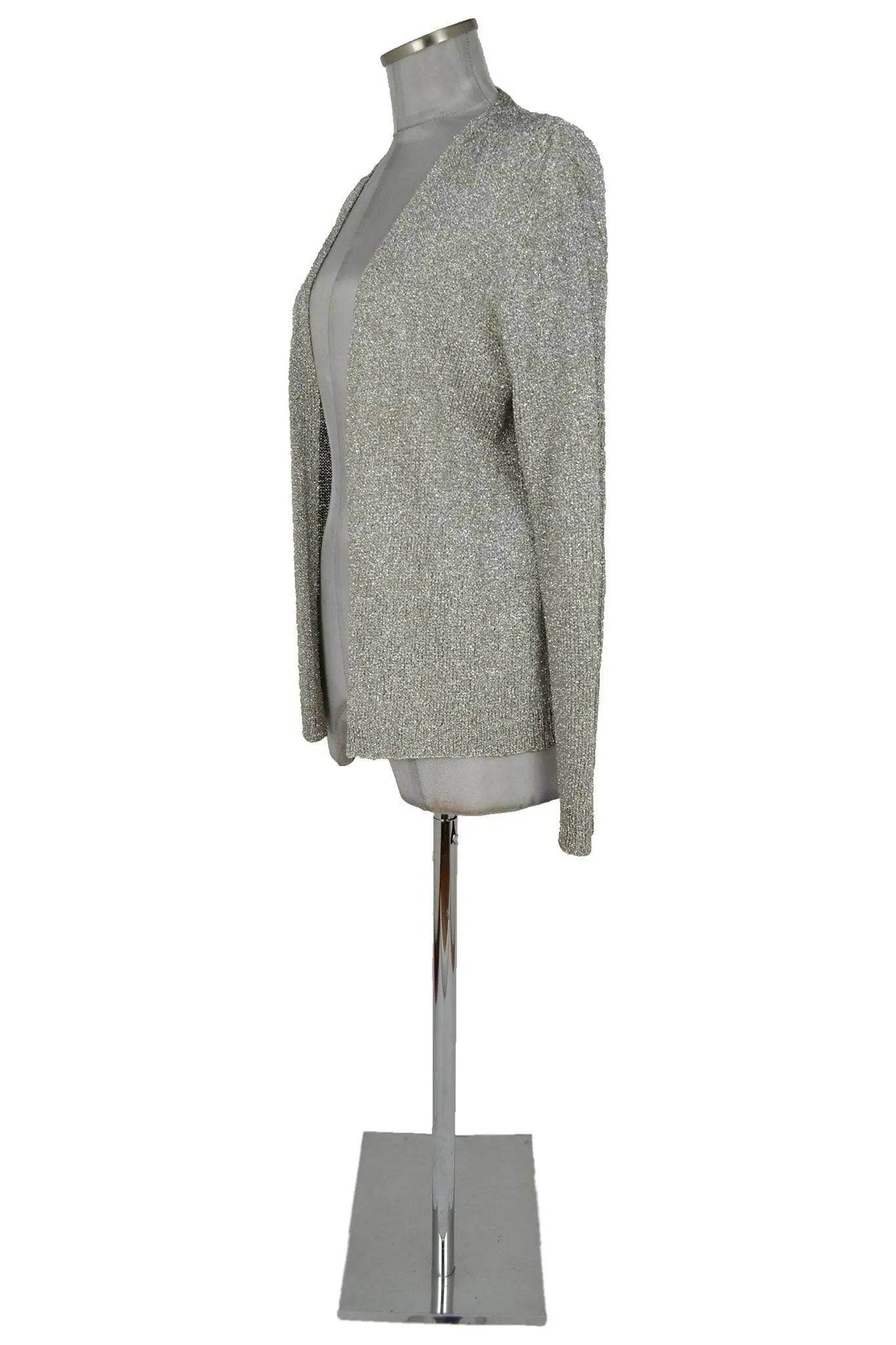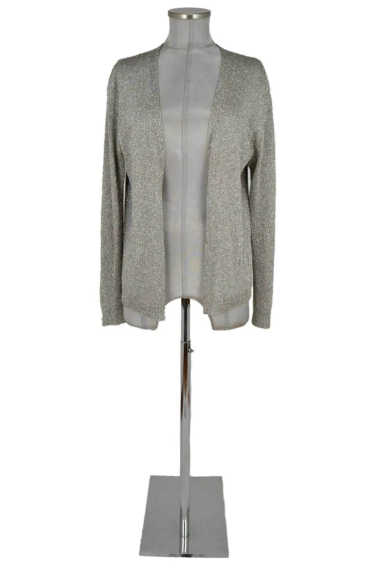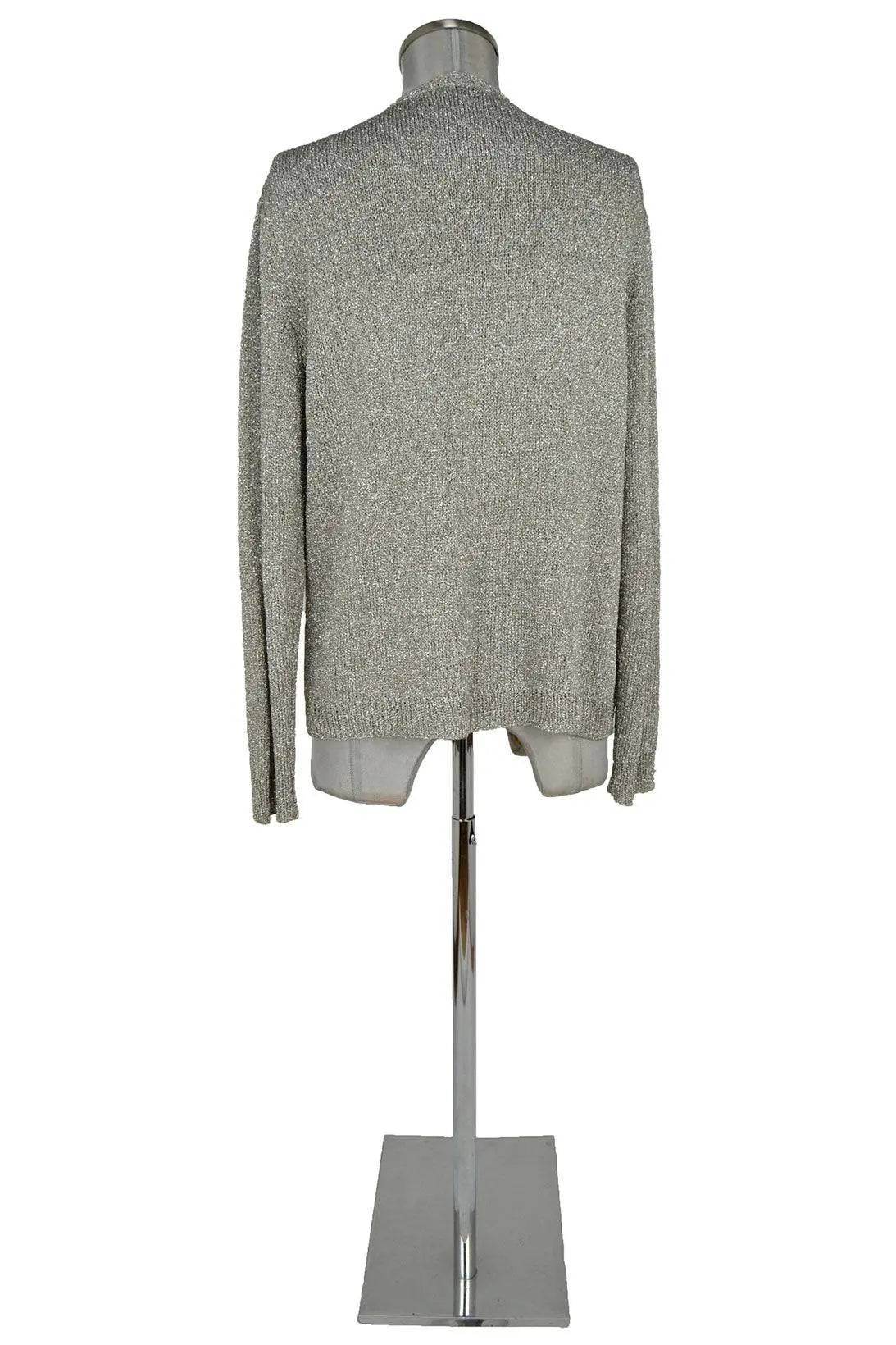Noleggio abito camicia donna di taglio maschile, a righine di lamé, con colletto a polo e polsi stretti; utilizzabile in varie occasioni da sola o come sottogiacca, ha uno stile brillante e sbarazzino che rimanda alle soubrette televisive degli anni '70, ma diventa elegante con un tailleur scuro o una gonna lunga.