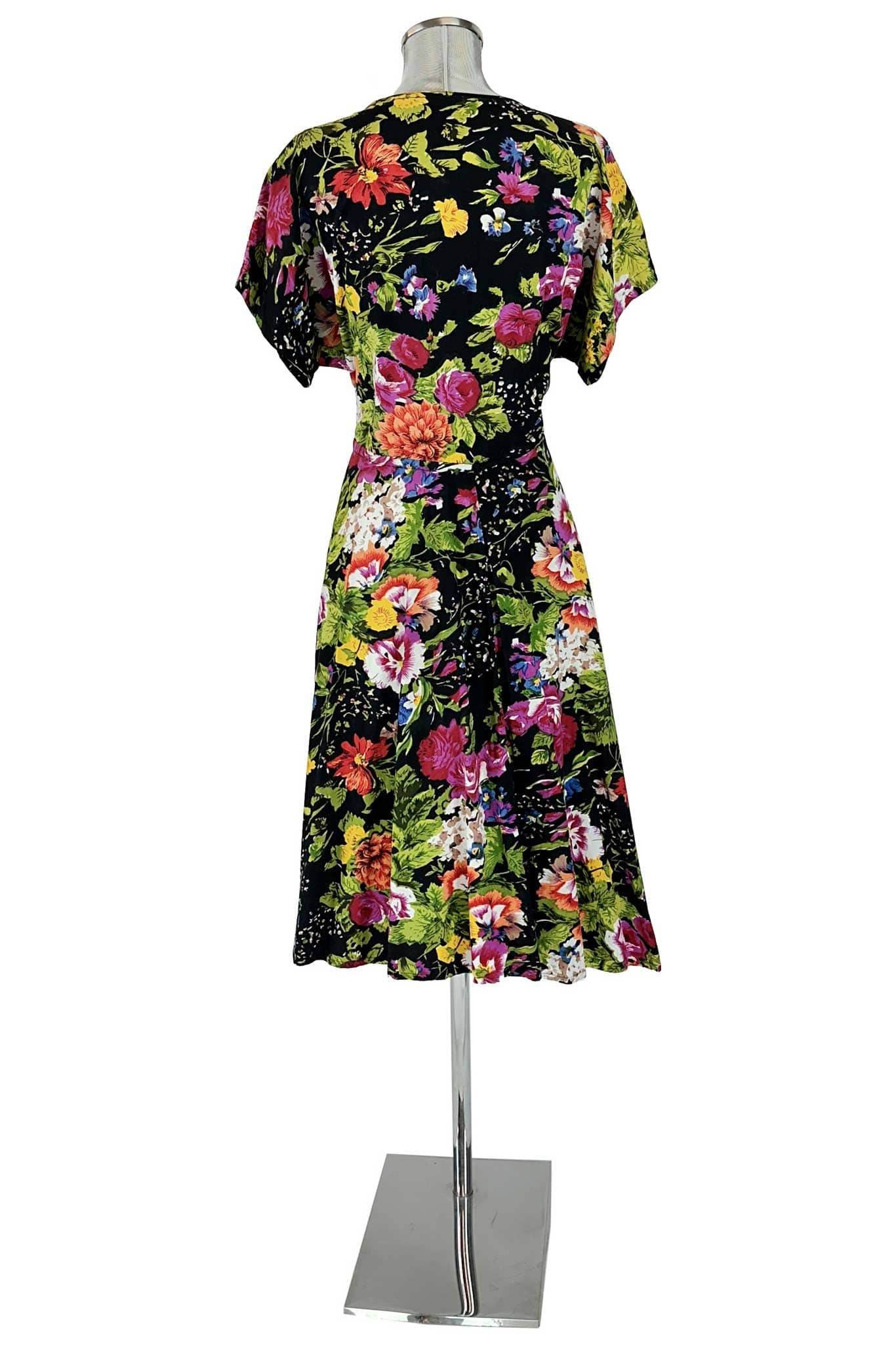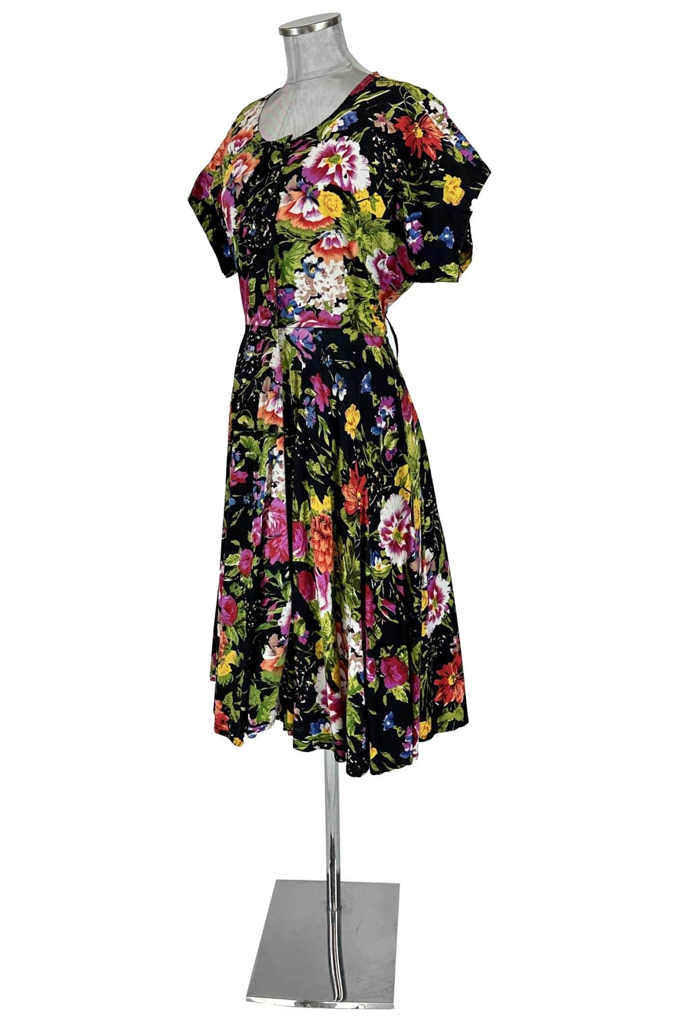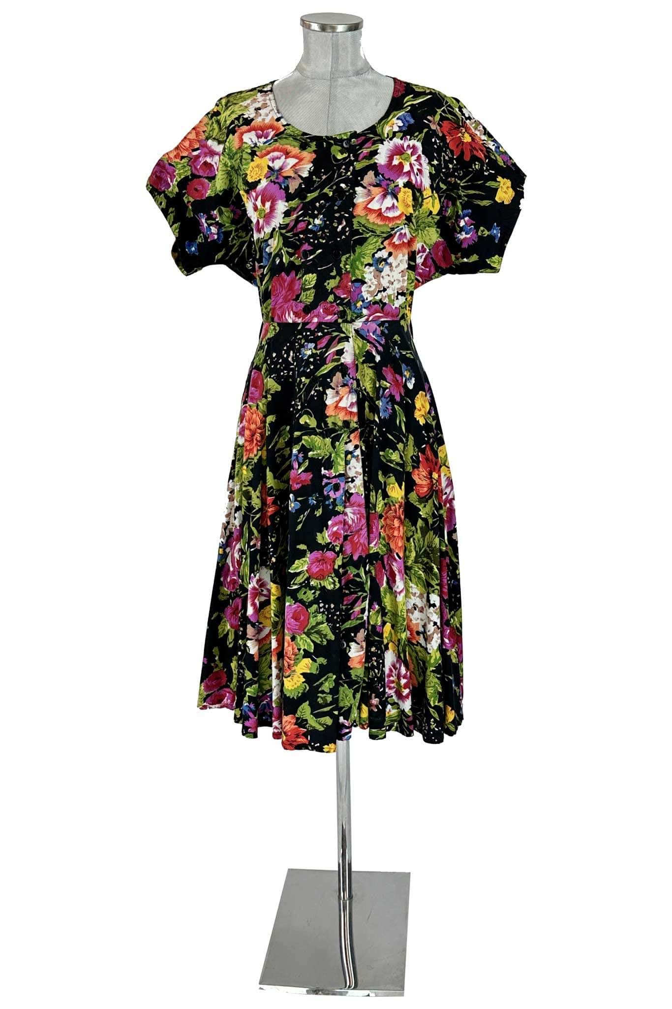 Design e Dettagli: L'abito presenta un design accattivante con una stampa floreale multicolore che risalta vividamente sul fondo nero. Le maniche corte e ampie aggiungono un tocco di femminilità e libertà, mentre la gonna svasata cade dolcemente, creando un movimento fluido ad ogni passo. Il taglio in vita sottolinea la silhouette, conferendo un aspetto snello e aggraziato.