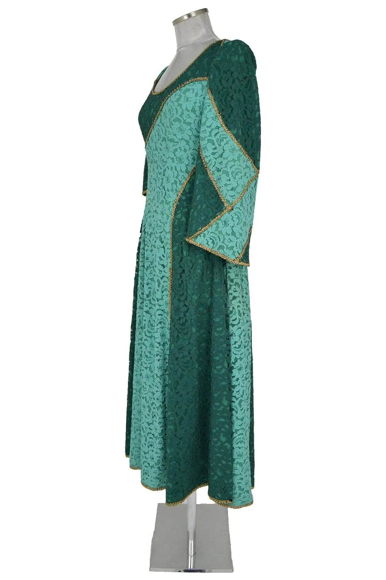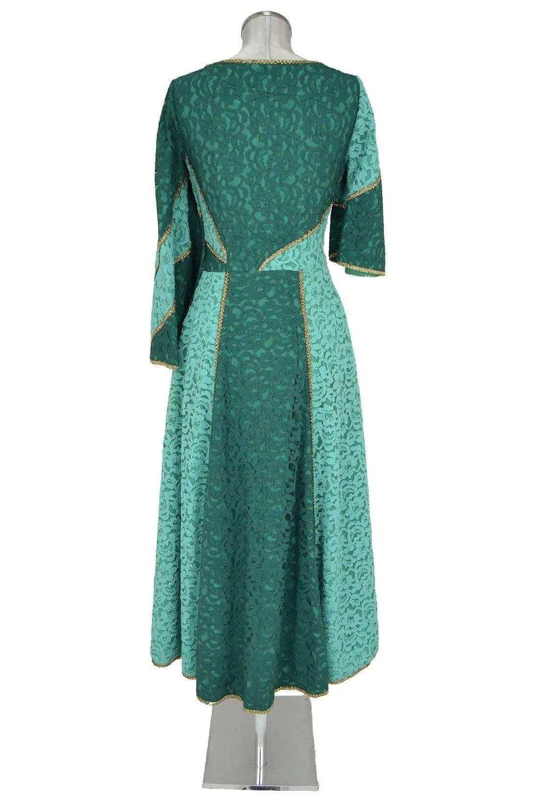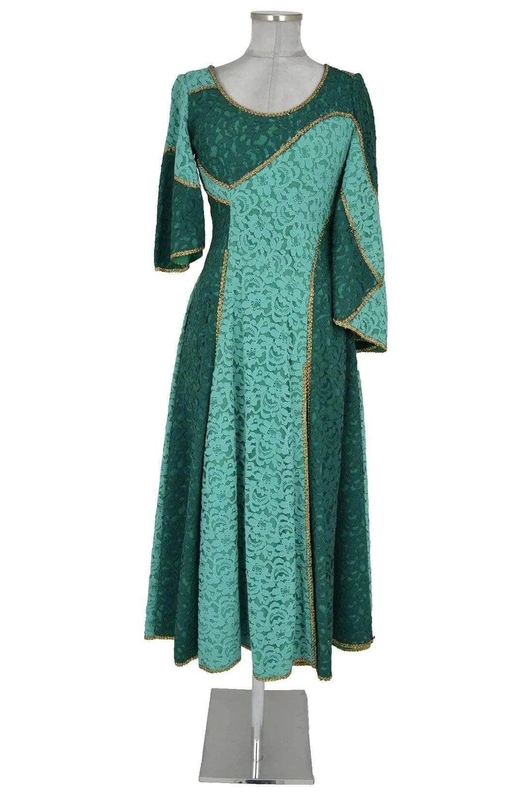 Noleggio originale abito donna asimmetrico di sapore medievale ma assolutamente moderno nei suoi tagli asimmetrici e maniche di lunghezze diverse. Bellissimo il gioco geometrico ottenuto alternando i due tessuti sui toni del verde acqua a effetto pizzo, con bordure oro e piccolo spacco nella gonna.